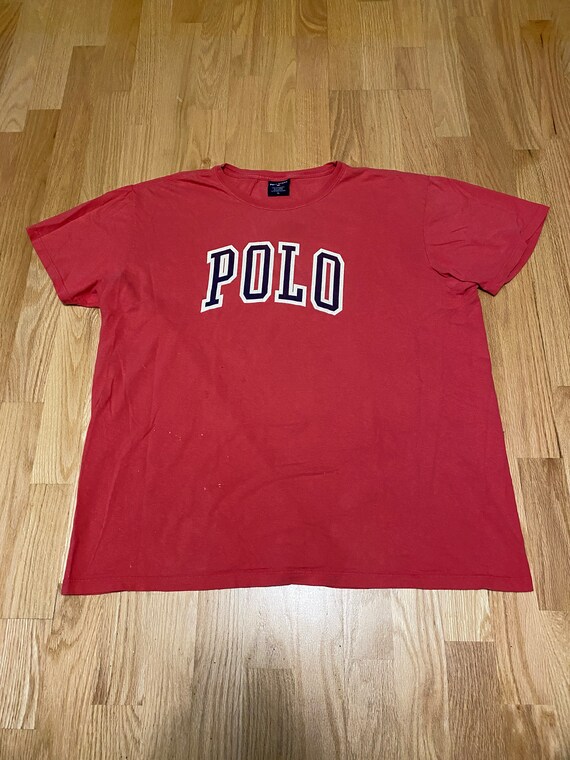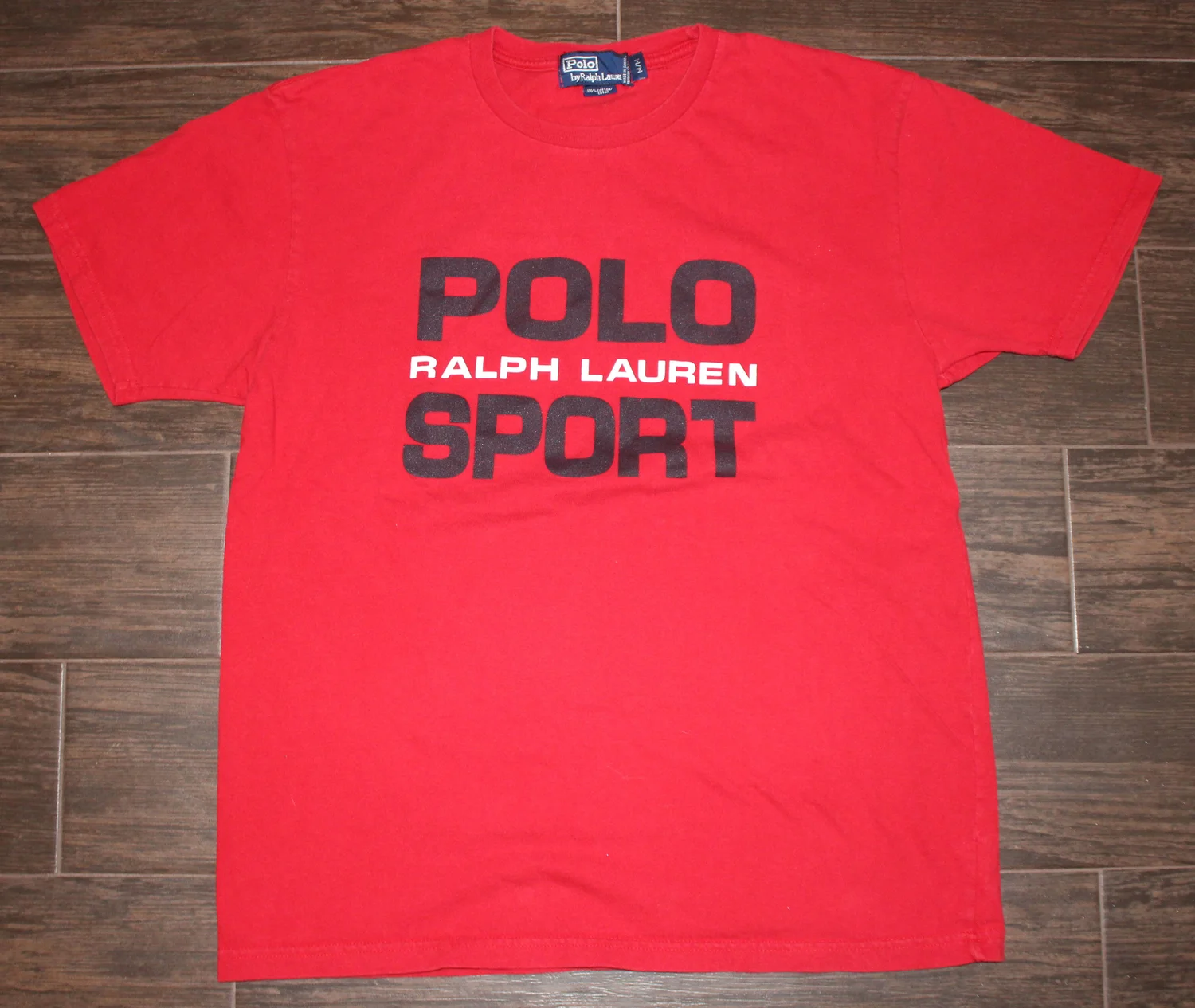 Vintage Polo Sport Ralph Lauren Red Black Spell Out Logo T Shirt Size M Roots